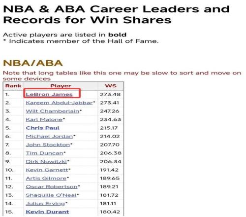 这场比赛后詹姆斯的常规赛Winshare(胜利贡献值)已经超过天勾贾巴尔登顶历史第一,詹姆斯是273.48,贾巴尔273.41,接下来勒布朗的每一场比赛都会刷新胜利贡献值历史新高,他再度成为行走的纪录产生仪。